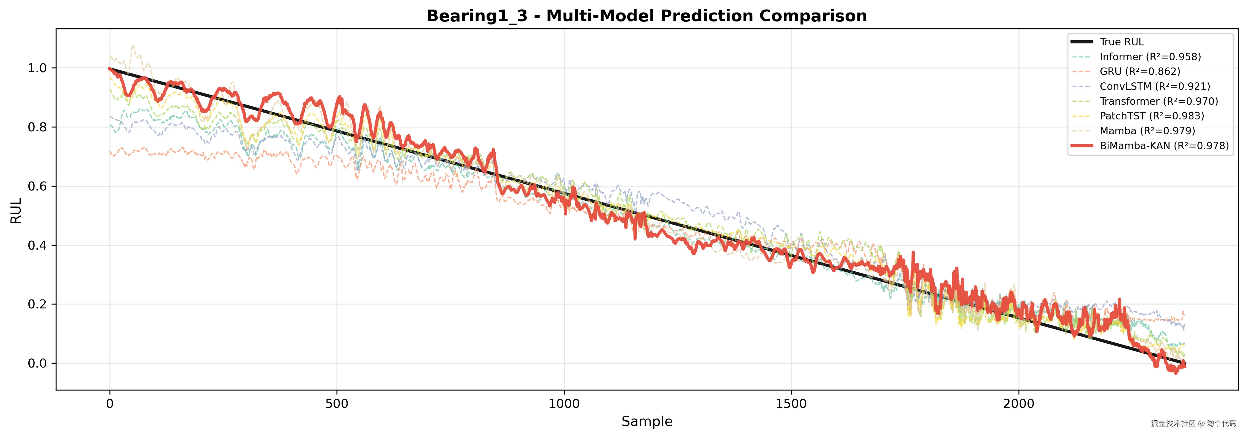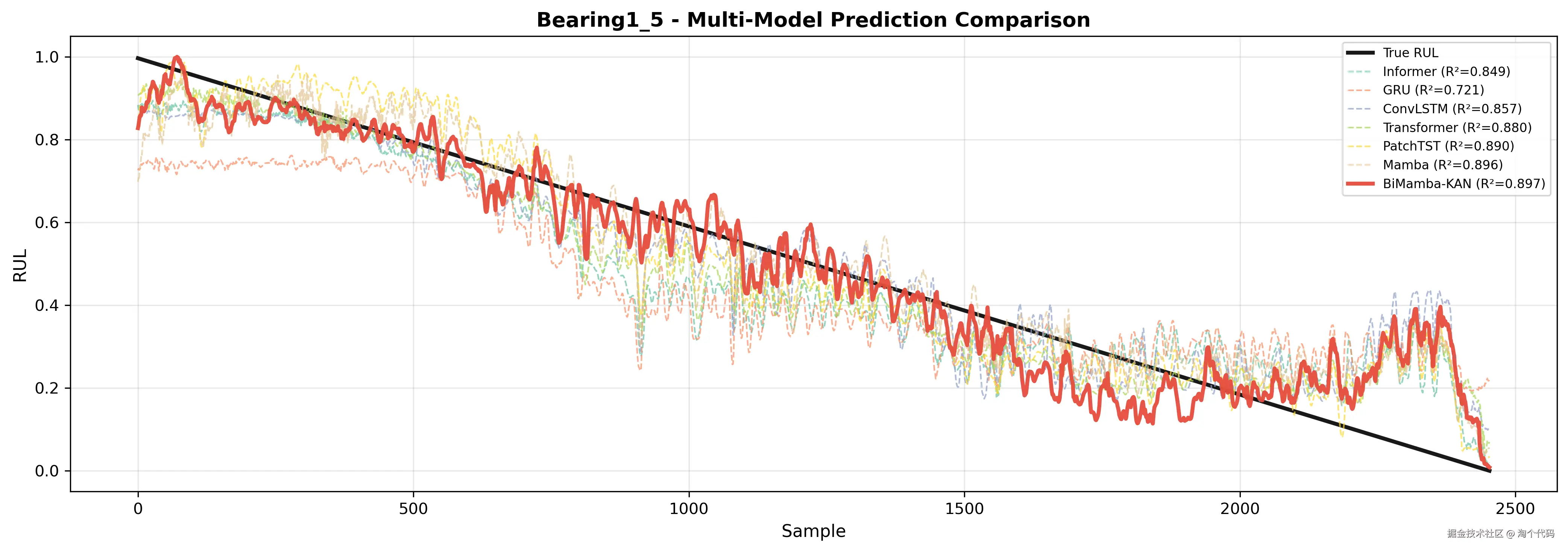在 PHM 2012 数据集上,BiMamba-KAN 模型取得了非常高的预测精度,优于 GRU、Transformer、Informer、PatchTST、Mamba 等对比模型。