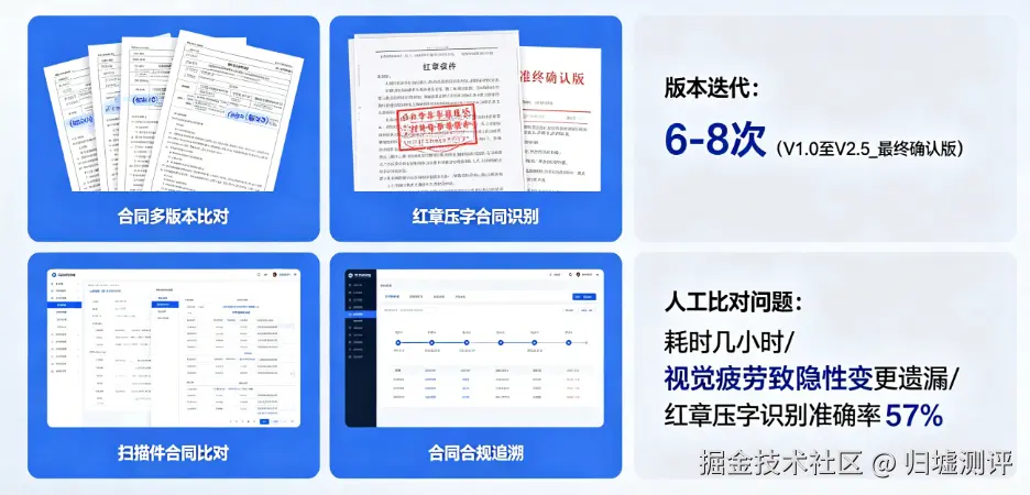 核心高频场景:合同多版本比对、红章压字合同识别、扫描件合同比对、合同合规追溯