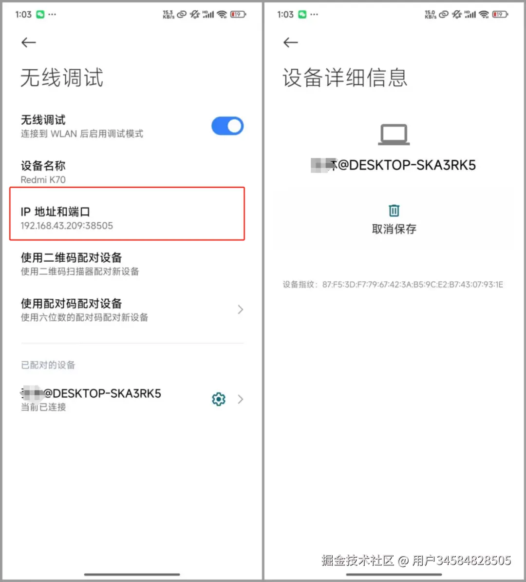连接设备:需要ip、端口,连接时的端口与上面配对是不一样的端口。(页面上的IP地址和端口这一项)