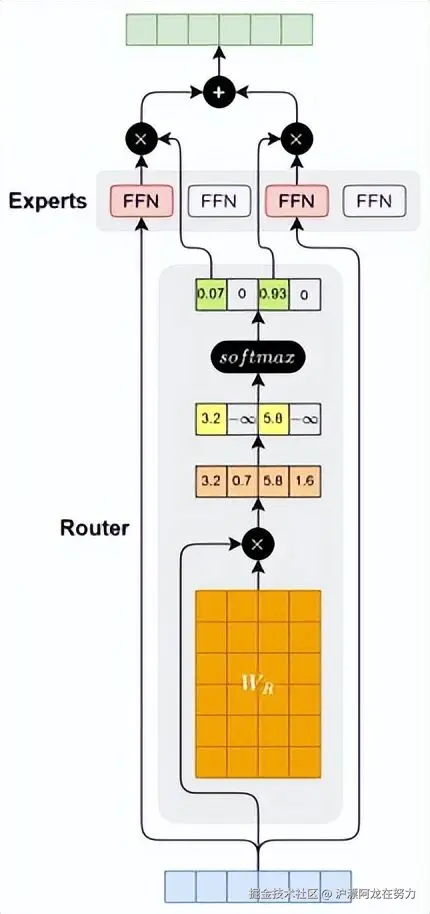 每个token进入MoE层后,路由器计算所有专家的得分。