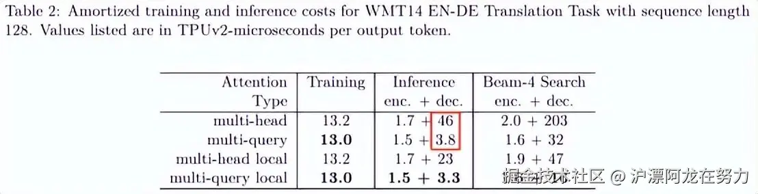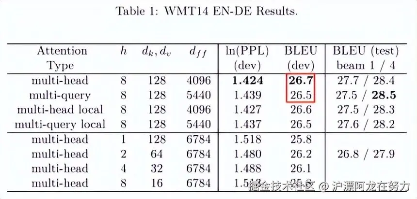 代价呢?表达能力略有下降,因为所有头看到的上下文信息是一样的。但论文实验表明,性能损失非常小(BLEU分数从28.4降到28.2),而推理速度提升数倍。因此MQA在当时很受欢迎,尤其适合对速度要求极高的场景。