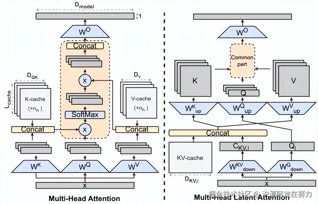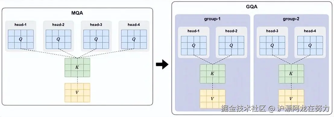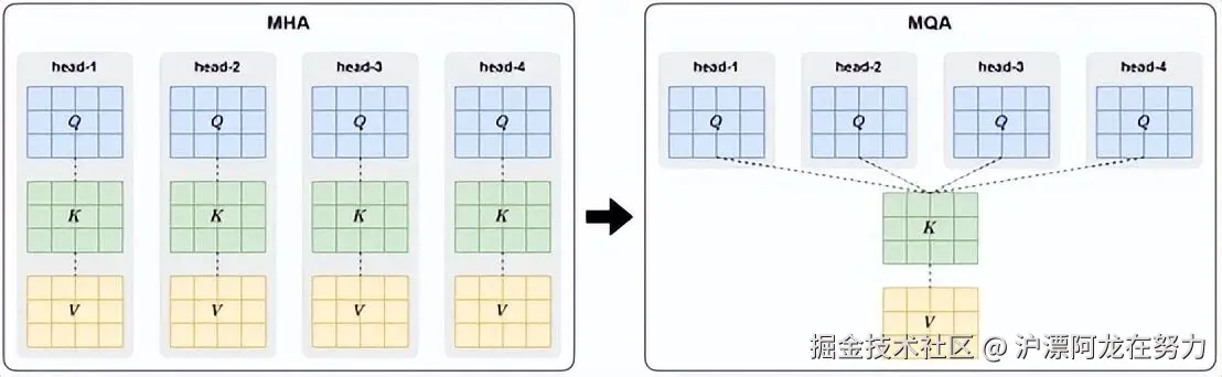 这样,KV缓存的大小直接从“头数×头维度”变为“1×头维度”,减少了H倍(H是头数)。对于32头的模型,KV缓存瞬间缩小到原来的1/32。