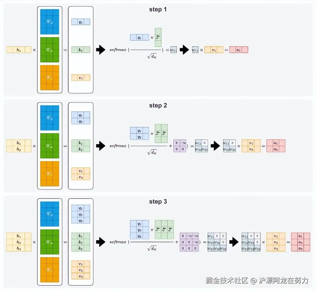 :让每个token能够“看到”序列中其他所有token,并决定哪些历史信息对当前预测最重要。比如在“他因为__,所以没去上班”中,模型需要关注“因为”后面的原因。多个“头”意味着模型从不同角度(语法、语义、指代等)同时捕捉关系。