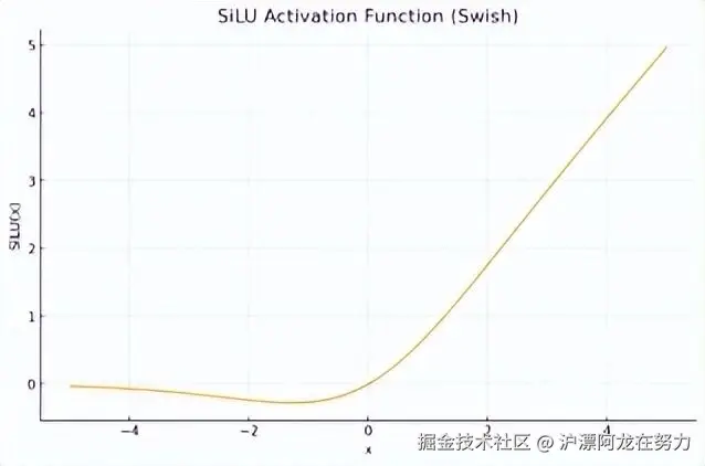 :x * σ(x),其中σ是sigmoid。曲线形状与GELU非常相似,但计算更简单。当Swish的可学习参数β固定为1时,Swish就等于SiLU。现在两者通常混用。