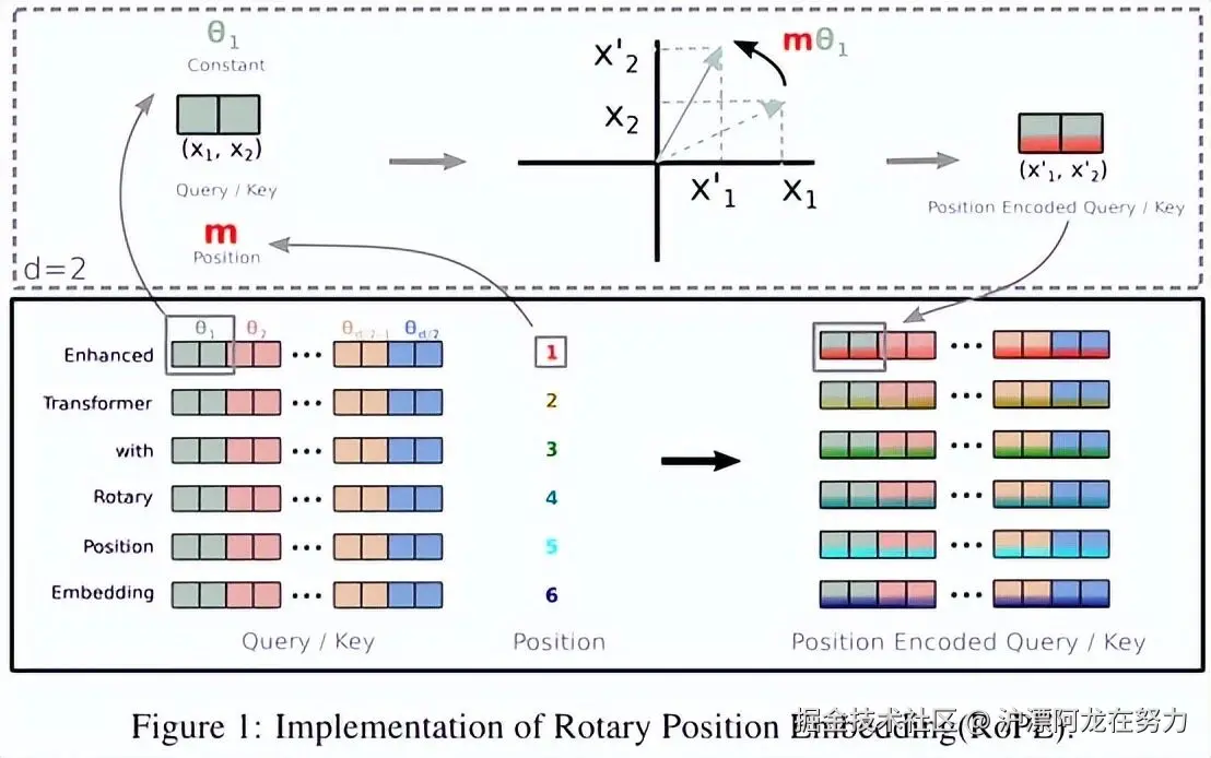 RoPE由国内研究者苏剑林提出,原理优雅:不对词向量加任何东西,而是对Query和Key向量的每一对维度进行旋转,旋转的角度与位置成正比。