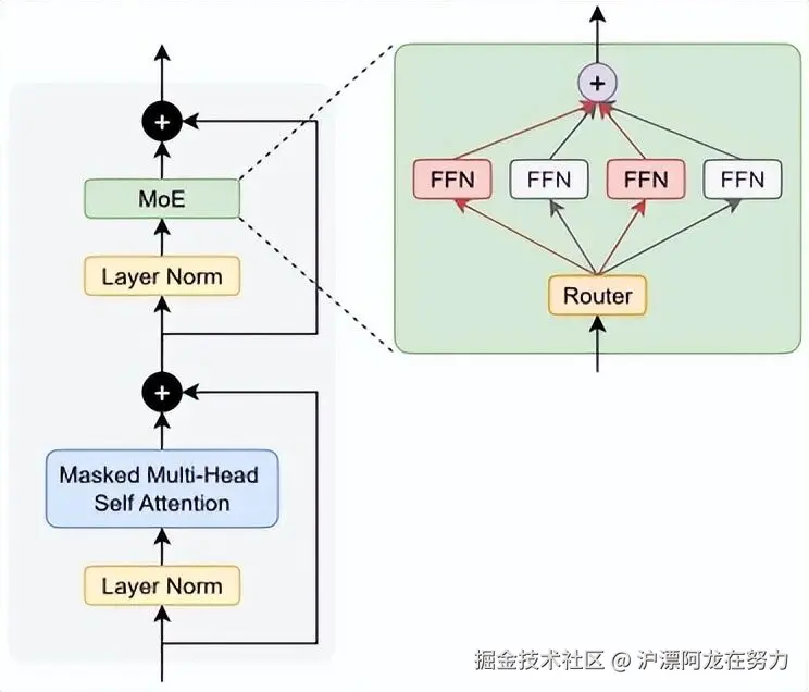 MoE不是修改单个FFN,而是把FFN层变成多个并行的专家网络,外加一个路由器。
