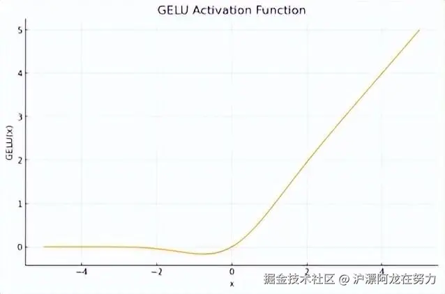 :x * Φ(x),其中Φ是高斯分布的累积分布函数。它不像ReLU那样硬截断,而是对负值进行平滑衰减。GPT-2、BERT等早期模型广泛使用。缺点是计算涉及误差函数,稍慢。