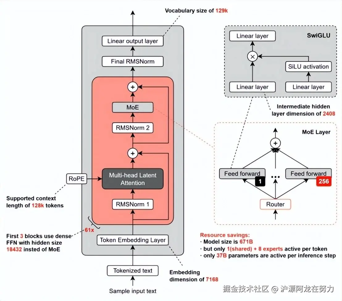 最后一层Transformer Block输出的向量,通过一个线性层(矩阵乘法)映射到词表大小(比如129k维),再经过Softmax函数变成概率分布。概率最高的token就是模型预测的下一个词。