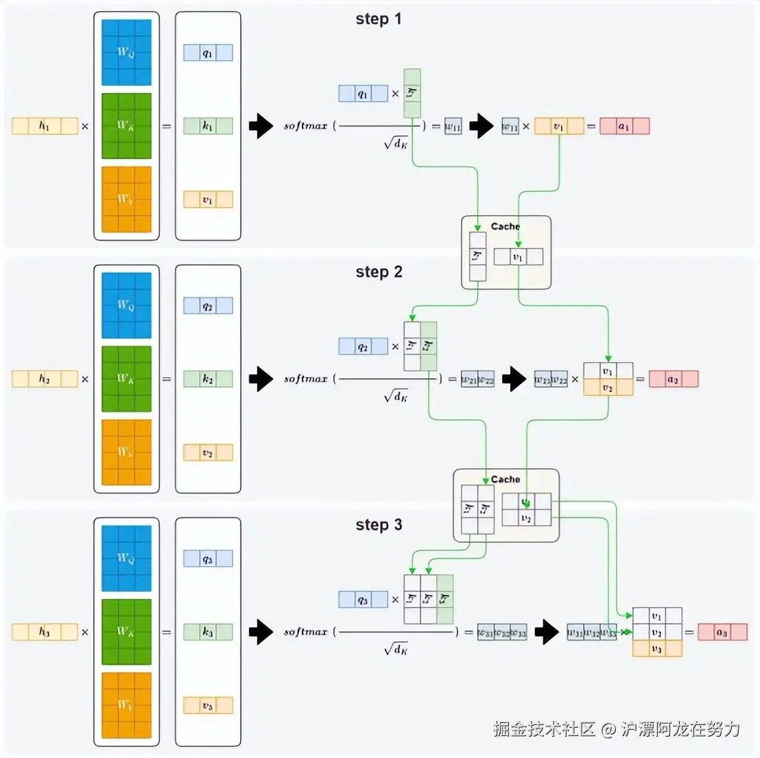 聪明的做法是:第一次遇到每个词时,就把它的K和V算好并保存下来,后面生成新词时直接读取。这就是KV缓存。