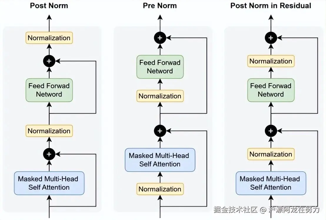 (原始Transformer):y = Norm(x + F(x))。归一化放在残差之后,会破坏恒等路径,导致深层训练不稳定。现在基本弃用。
