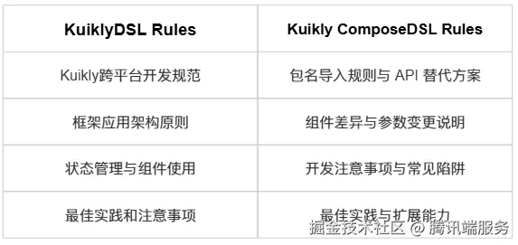 KuiklyDSL 是一套私有 DSL,现阶段大模型的训练语料存在一定欠缺,缺乏规则约束时极易生成不可用的代码;而 Kuikly ComposeDSL 虽然基于 Compose 范式,但在包名导入、组件 API、参数定义等方面与官方 Jetpack Compose 存在部分差异,模型很容易误用。因此,我们围绕两套 DSL 的高频问题,分别提供了对应的 Rules: