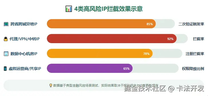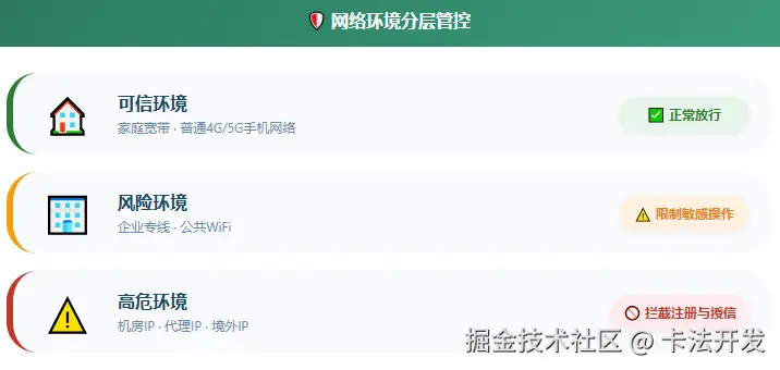 - 高危环境:机房IP、代理IP、境外IP → 直接拦截注册与授信