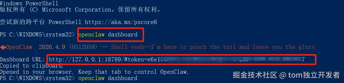 在打开控制台看是否可以访问发送指令: openclaw dashboard