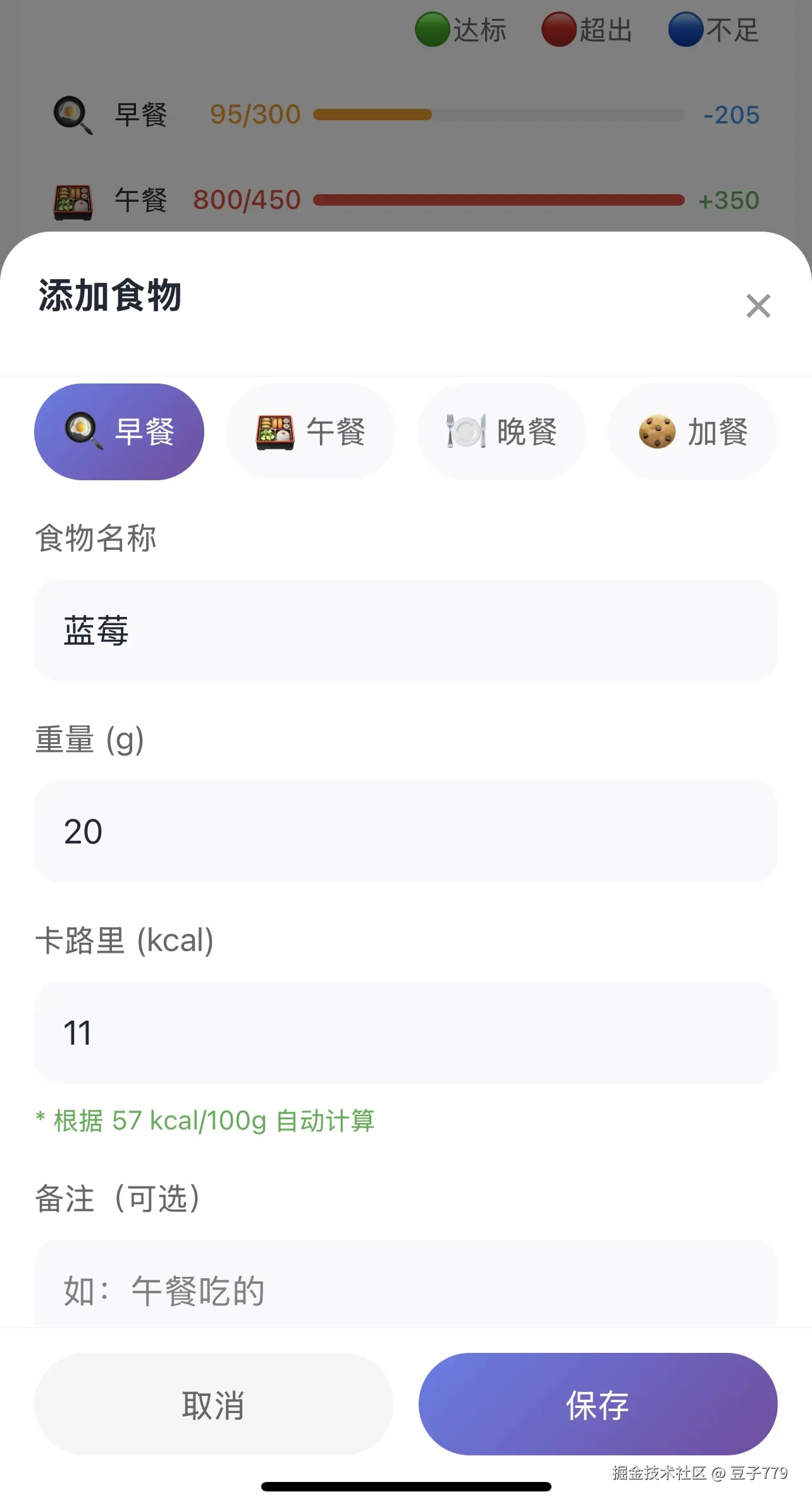 支持添加、编辑、删除食物记录,内置 1000+ 本地食物库,暂时不接入 API,保证稳定。