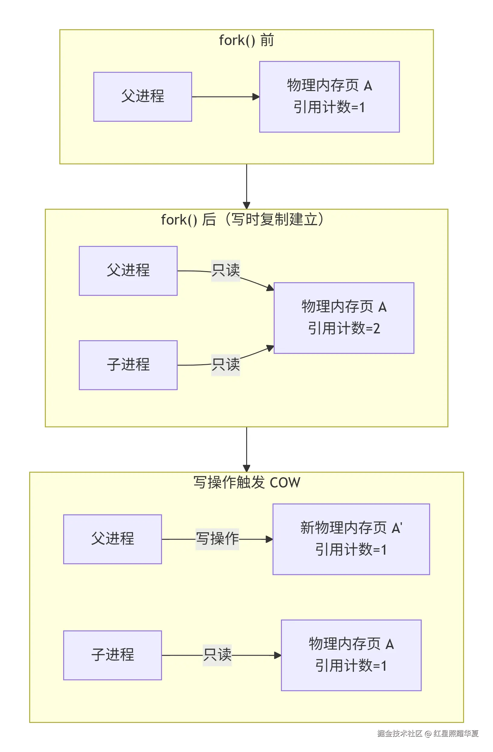 它们的实现都深度依赖一个操作系统机制:写时复制(Copy-On-Write,COW) 。Redis 通过 fork() 创建子进程来完成实际的磁盘写入,主进程继续服务请求。这个过程看似简单,背后却涉及页表复制、缺页异常处理、内存引用计数等内核层面的复杂交互。