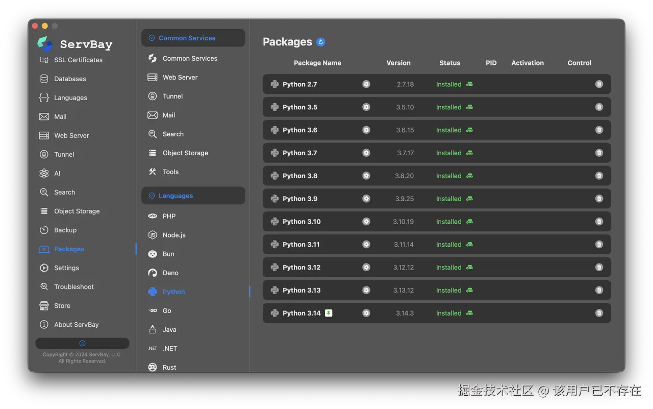 开发者可以通过ServBay一键部署Python、Node.js等多种编程环境,并支持不同版本之间的自由切换。