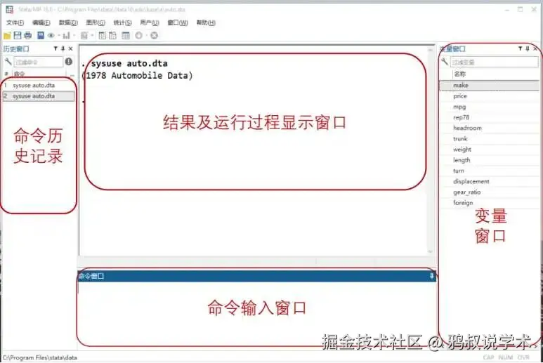 Stata包括命令窗口、变量窗口、结果窗口、历史窗口等。了解各部分的功能将帮助你快速定位自己所需的操作。