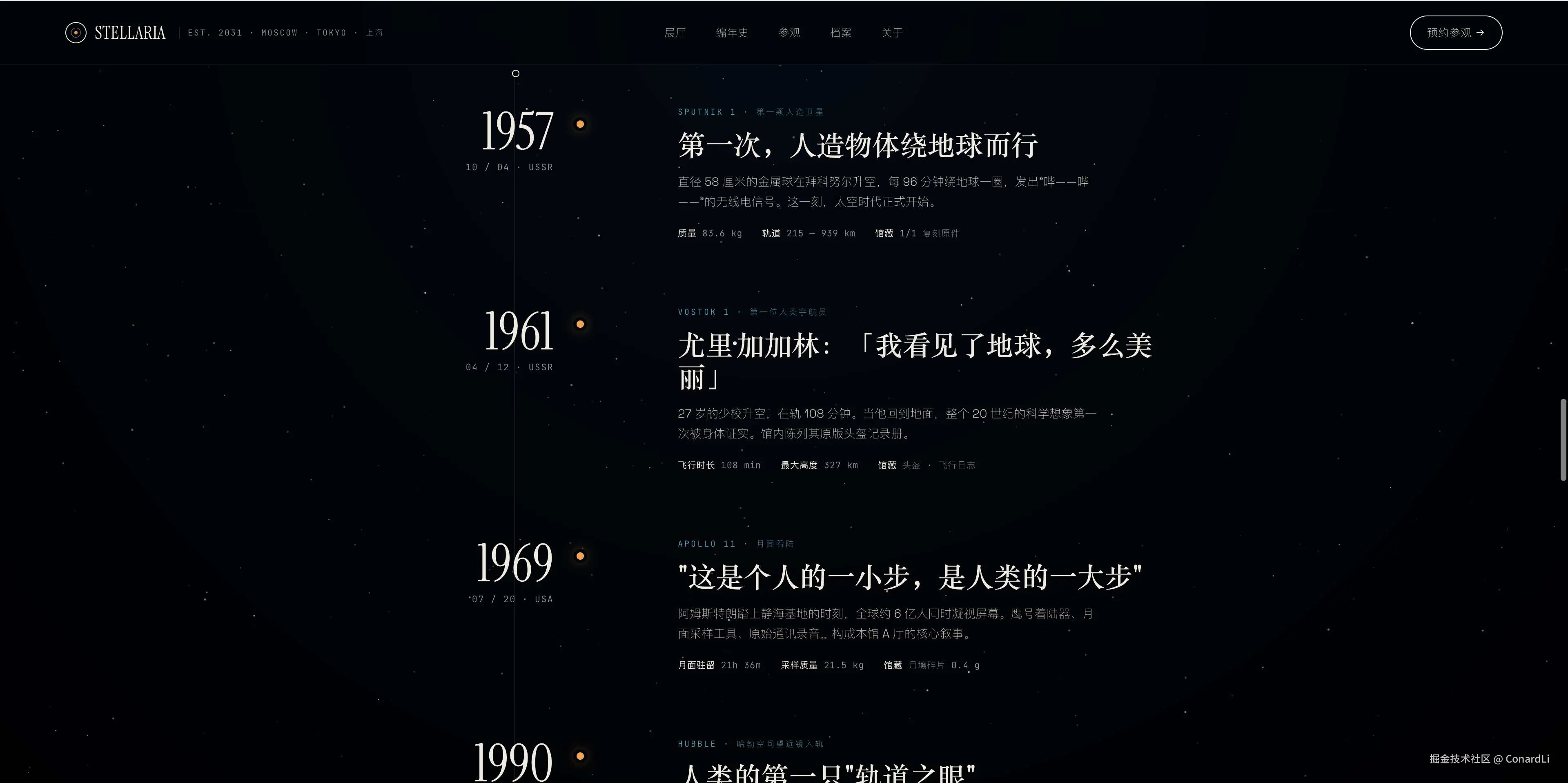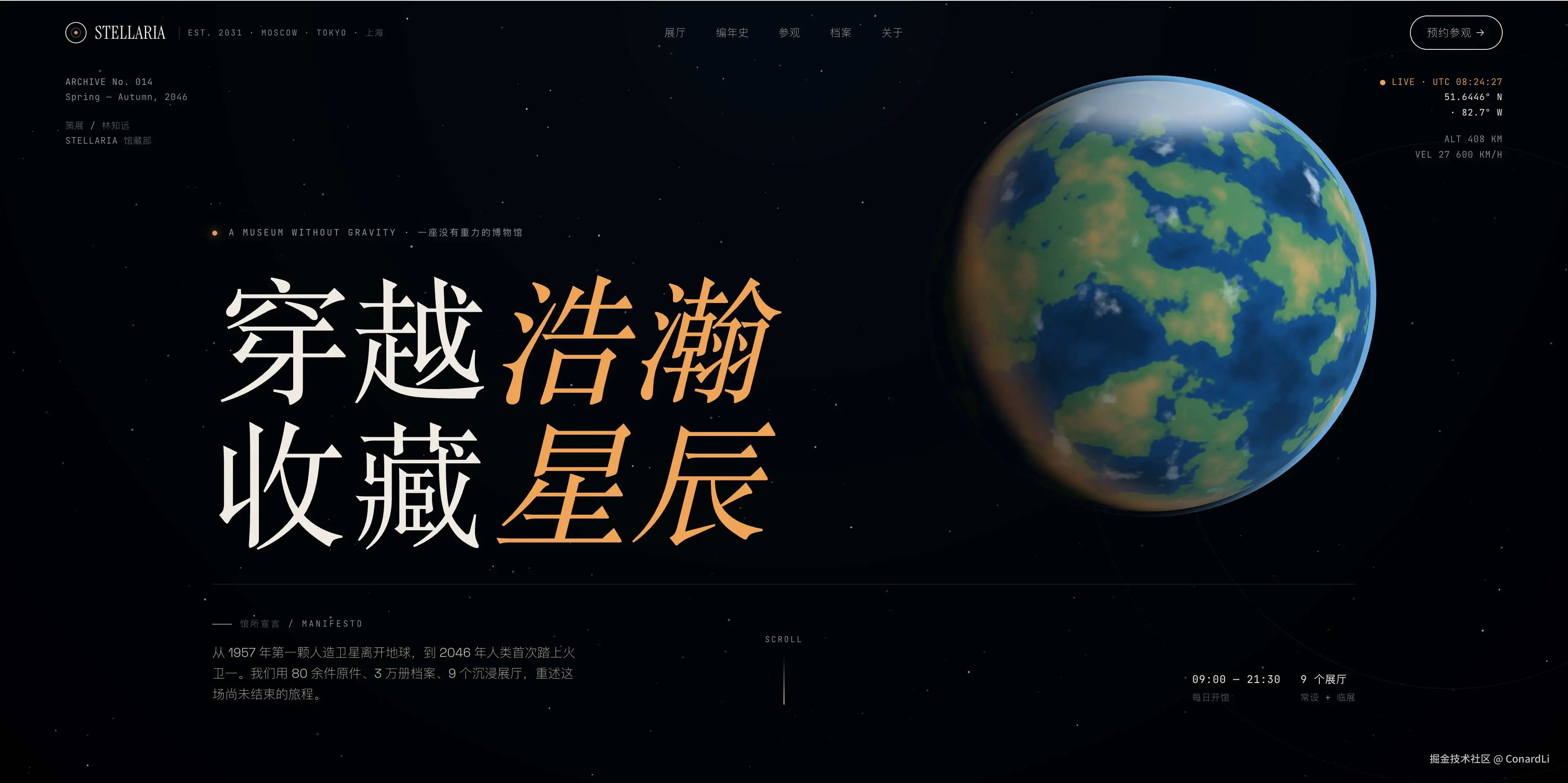 细节更精致。 导航栏 logo 是三个同心圆 + 一个 ember 色小圆点(用 CSS ::before 和 ::after 实现),有天体轨道的隐喻。页面右上角有一组实时坐标数据(ISS — LIVE TELEMETRY),作为装饰性信息元素。整个页面用 clamp() 做流式排版,间距全部用 CSS 自定义属性管理。