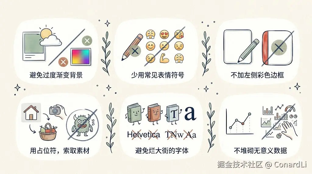 - 不要用烂大街的字体:Inter、Roboto、Arial、Fraunces、system-ui