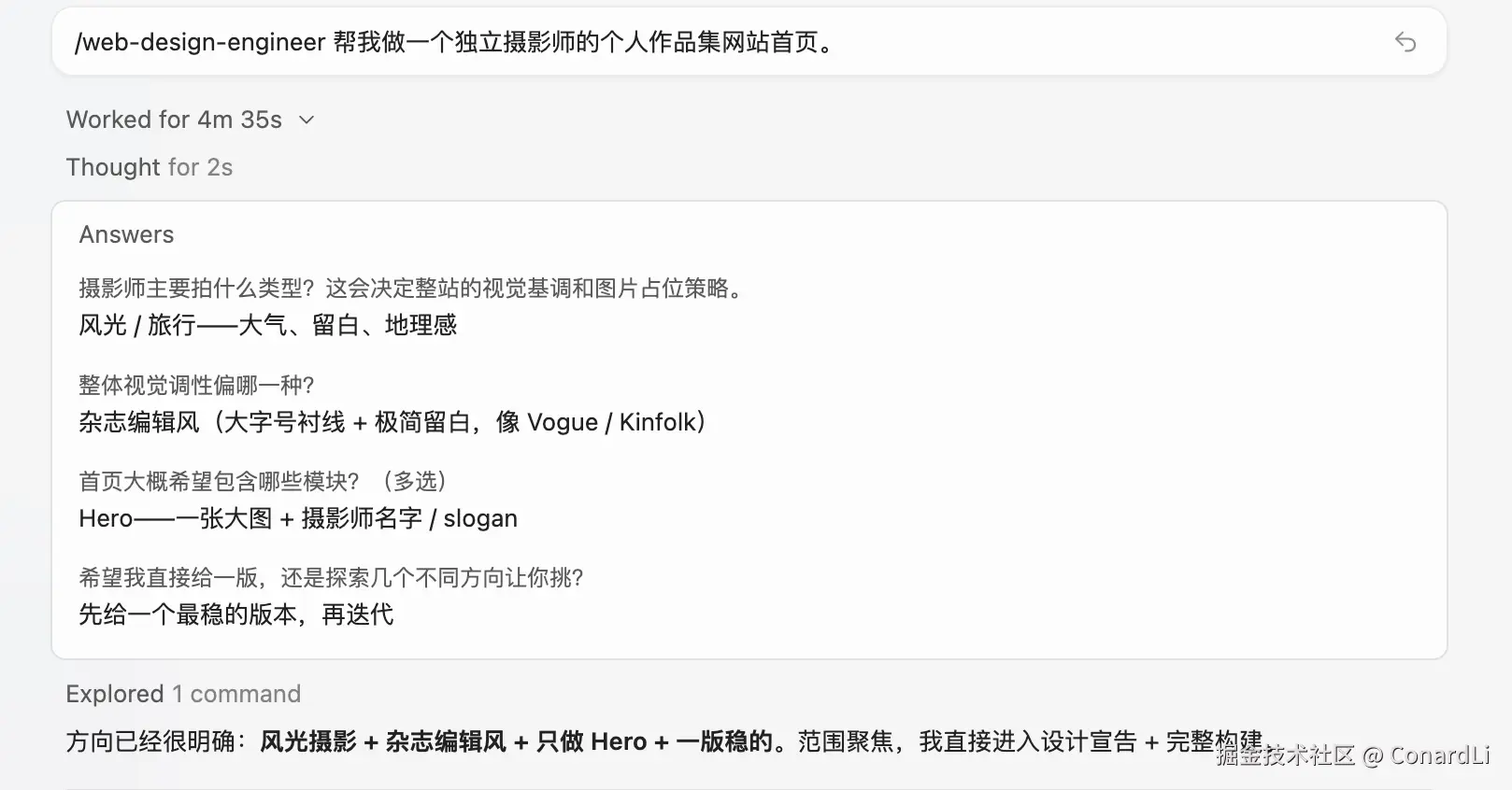 这个微妙的角色倒转带来两个效果:AI 会更主动地做决策(设计师该有的判断力),同时会在关键节点征求用户意见(向经理汇报)。