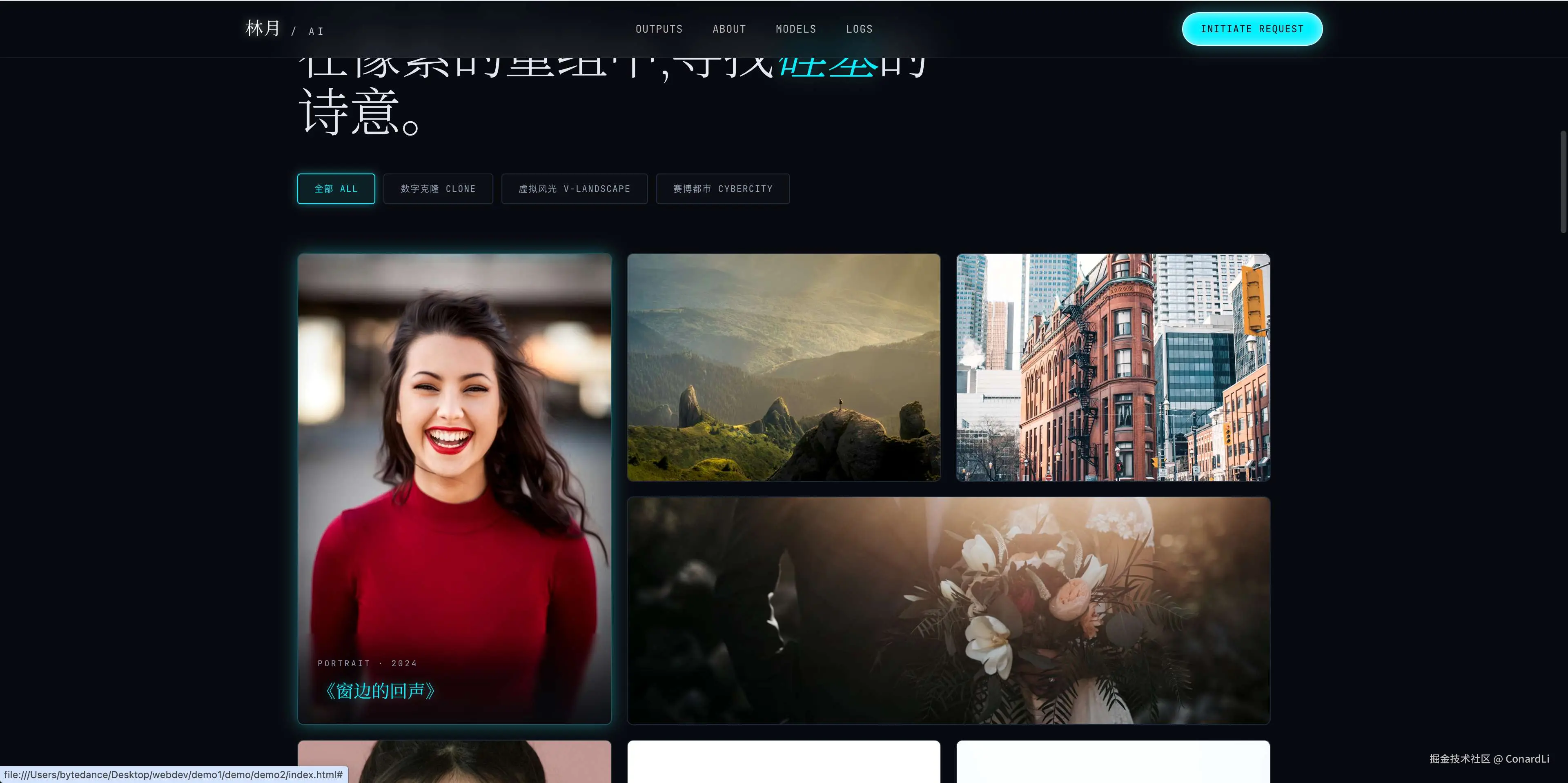 配色体系完全不同。 用了 oklch 色彩空间定义整套色彩系统 — var(--ink) 是 oklch(0.10 0.015 250),var(--ember) 是 oklch(0.78 0.13 65)。整个色彩方案更加克制和高级,没有浓烈的霓虹感,取而代之的是一种接近杂志印刷品质的深沉色调。
