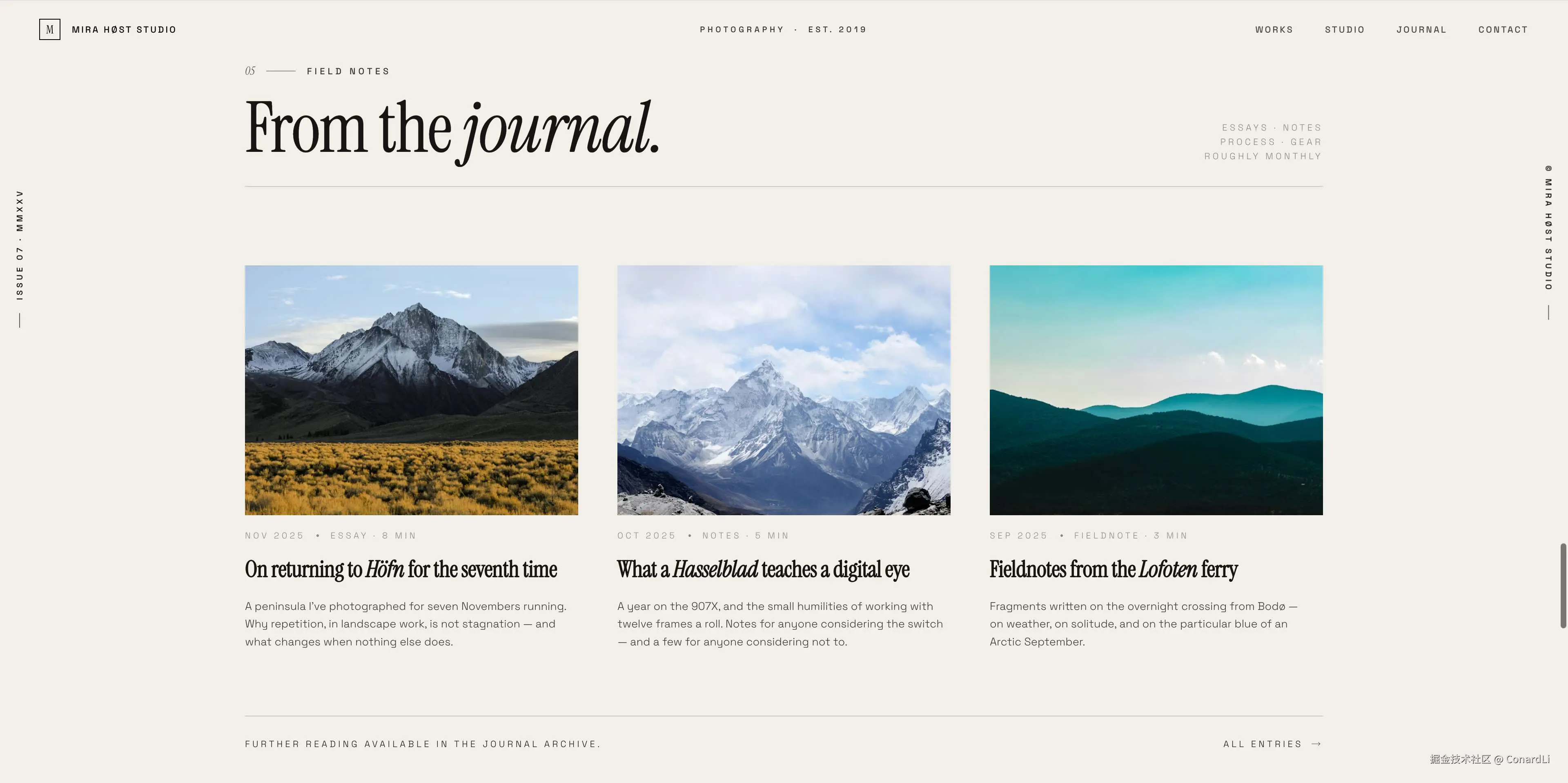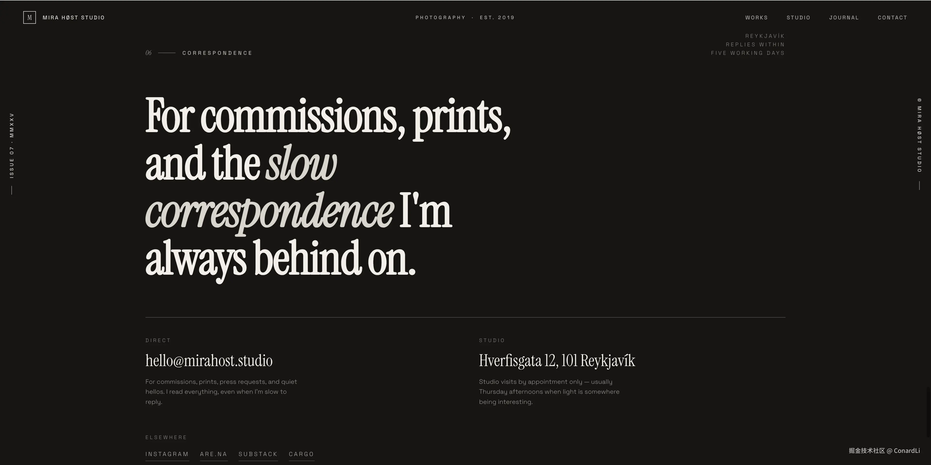 布局语言: 杂志编排式的。左右两侧有固定的竖排文字("Issue 07 · MMXXV" 和 "© Mira Høst Studio"),用
