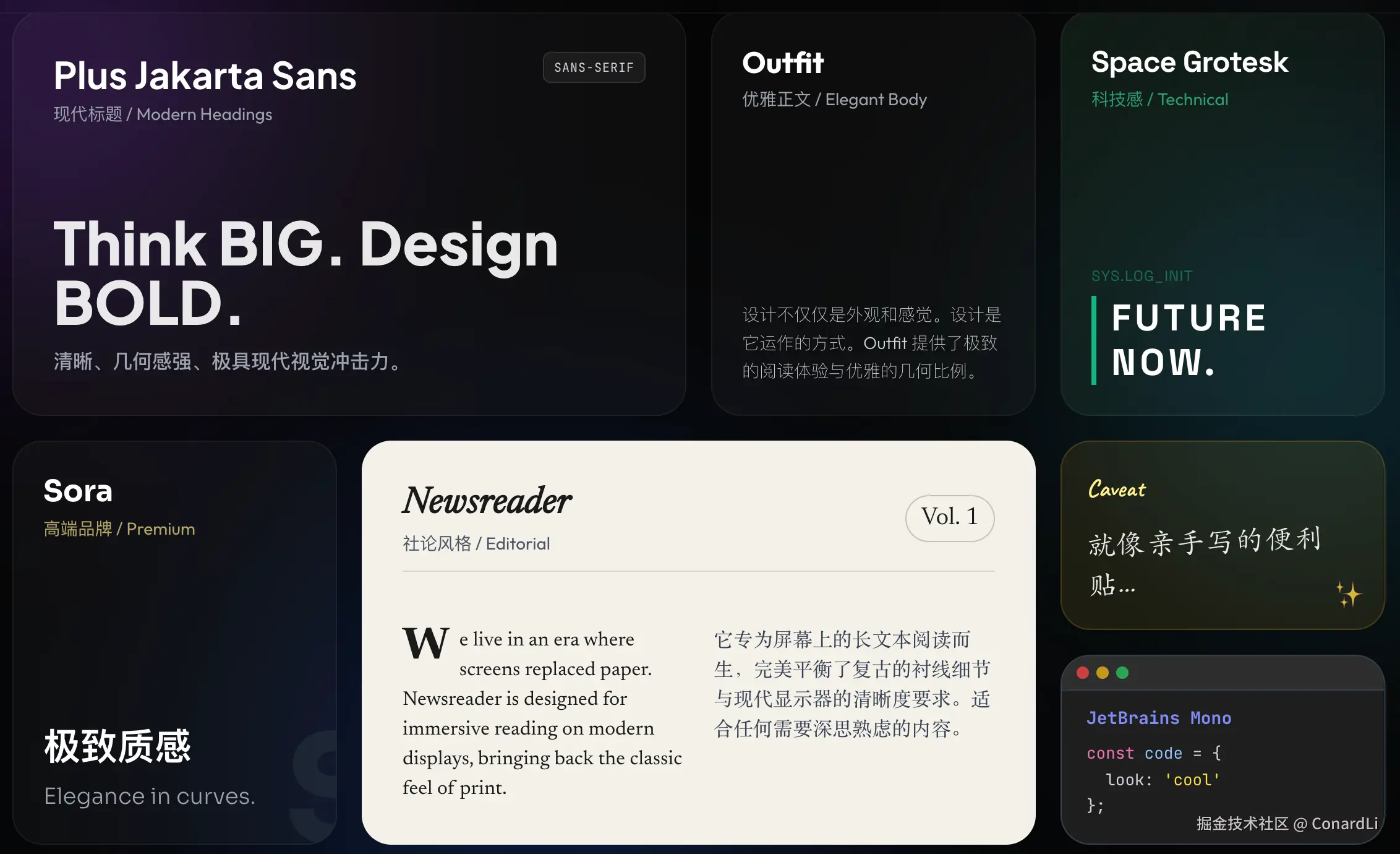 比如推荐 Plus Jakarta Sans、Space Grotesk、Sora、Newsreader 等相对小众但品质出色的字体。