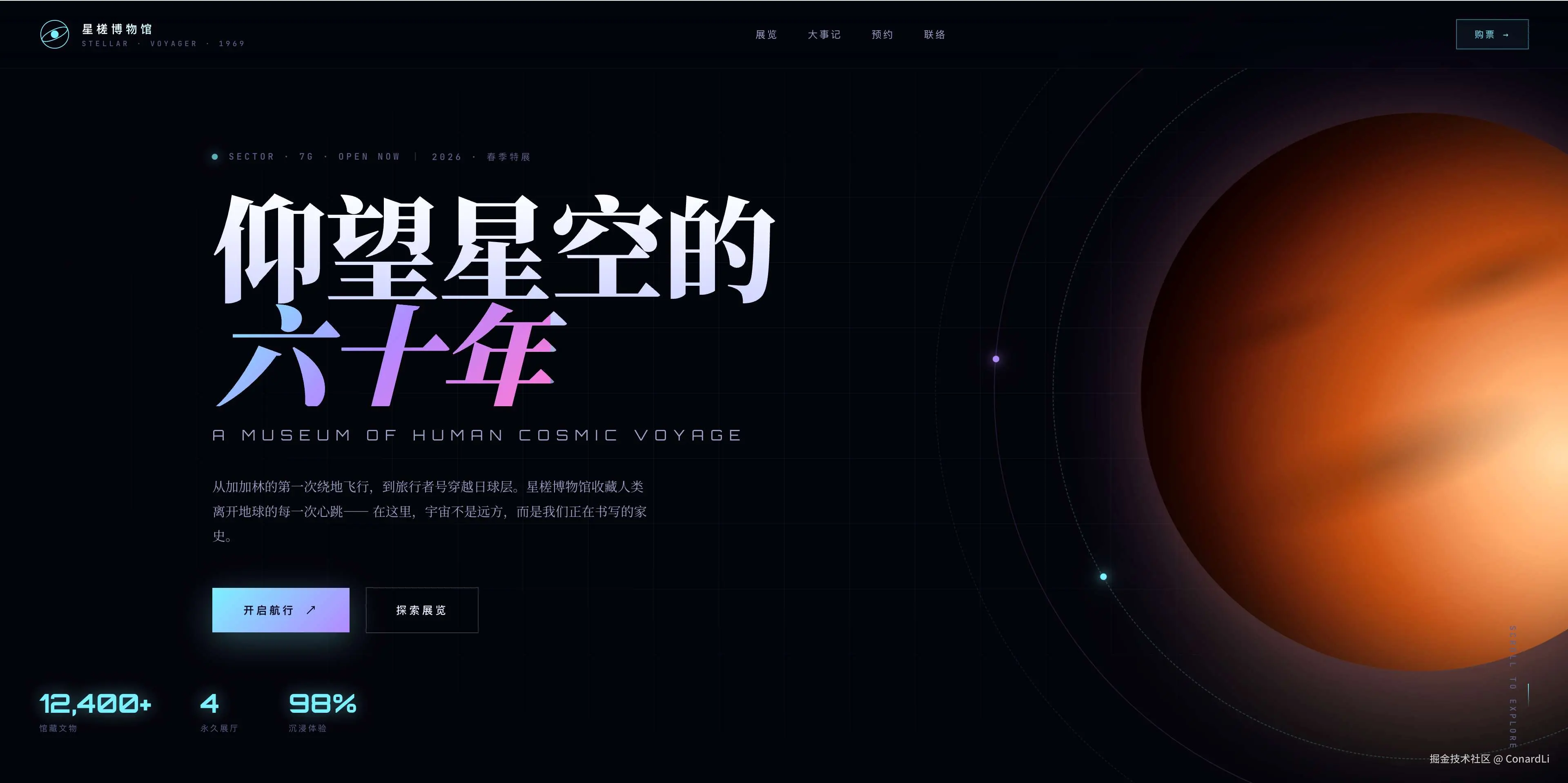 - 字体选择偏传统。 Orbitron 是一个非常"直觉"的太空字体选择 — 几乎所有 AI 做太空主题都会用它。辨识度不够。