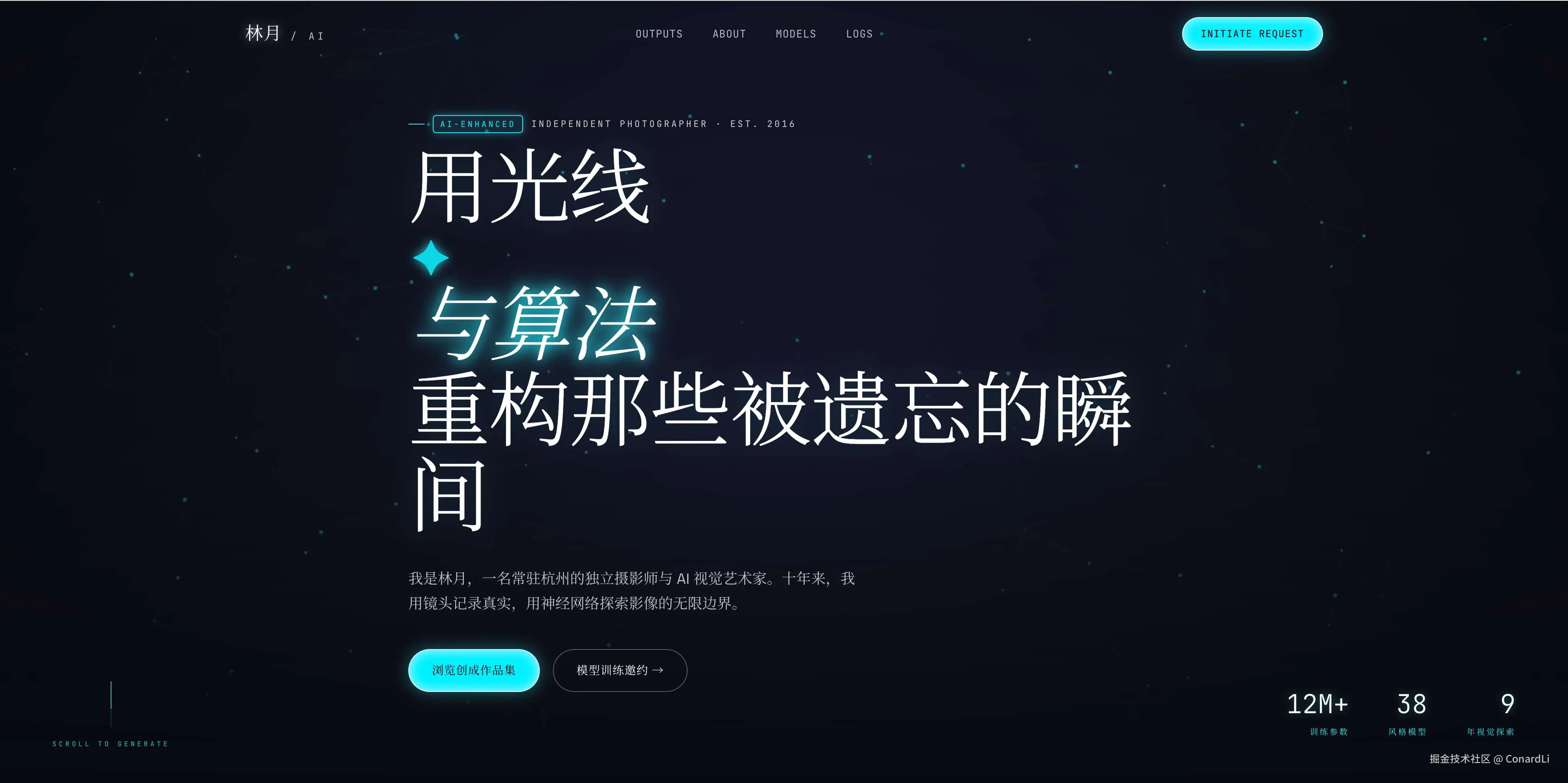 字体选择更考究。 Instrument Serif + Space Grotesk + JetBrains Mono 三件套。Instrument Serif 的衬线字做大标题,有杂志编辑质感;Space Grotesk 做正文,技术感但不冰冷;JetBrains Mono 做辅助信息(坐标、编号),自带科技叙事。
