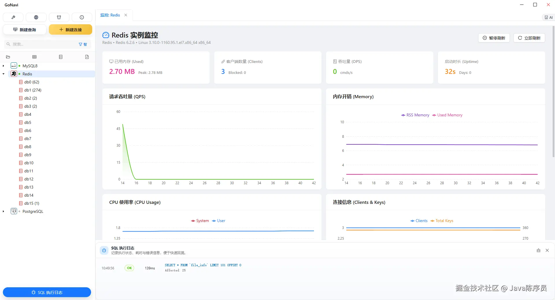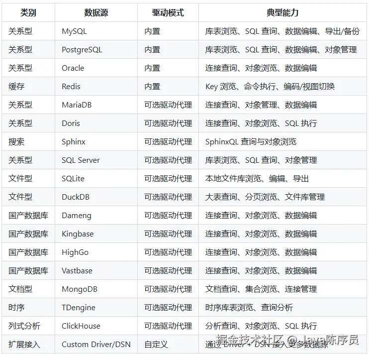 - 多数据源统一管理:支持 MySQL、PostgreSQL、Oracle、Redis、SQL Server、MongoDB、ClickHouse 等主流数据库,同时兼容达梦、金仓等国产数据库
