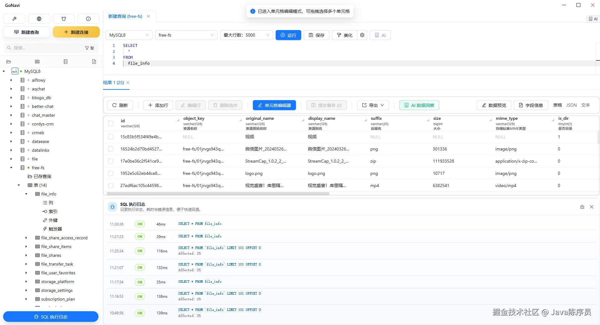 - 强大 SQL 编辑体验:内置 Monaco 编辑器(VS Code 同款),支持语法高亮、智能补全、多标签页、执行日志与耗时统计