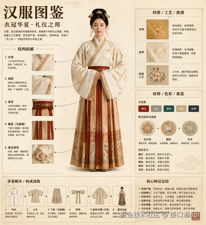 网友实测的“博物馆图鉴式中文拆解信息图”更是杀手锏。你只需要提供一个主题(如:汉服、凤冠、盔甲),它就能自动排版出带有结构拆解、中文引线标注、材质特写、纹样寓意的高级科普图。背景还会自动采用绢纸质感,专业度堪比国家博物馆展板!