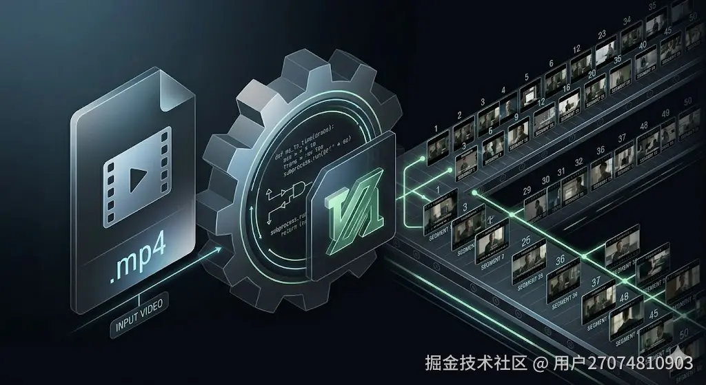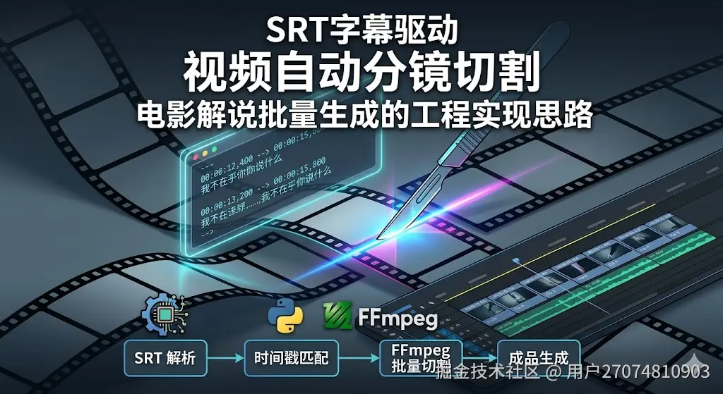 本文围绕这个思路,拆解一套基于 SRT 时间戳驱动的视频自动分镜切割方案,涵盖 SRT 解析、时间戳匹配、FFmpeg 命令封装,以及工具链整合的完整实现路径。