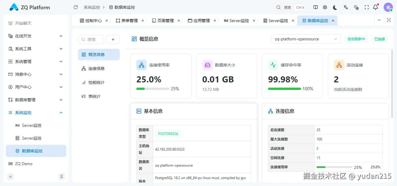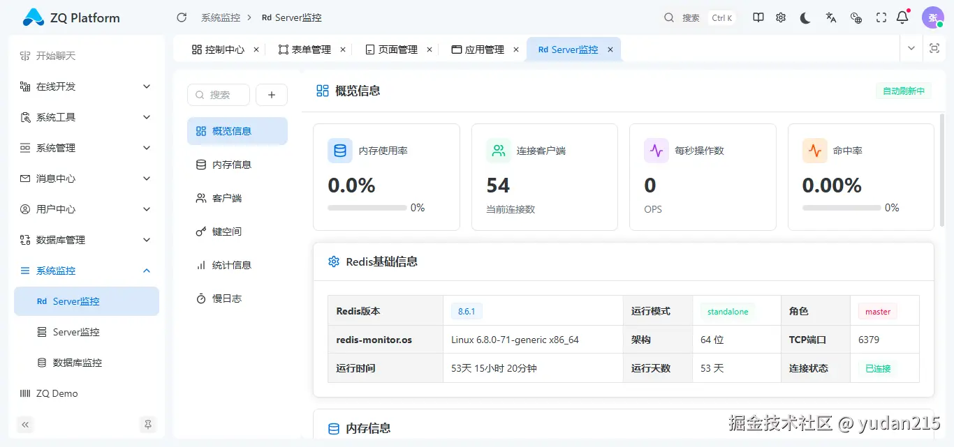 作为一款企业级平台,ZQ Platform 不仅能建表单,还自带了极其专业的运维监控模块。你可以直观地在后台看到 CPU、内存、磁盘IO、网络IO的实时状态。