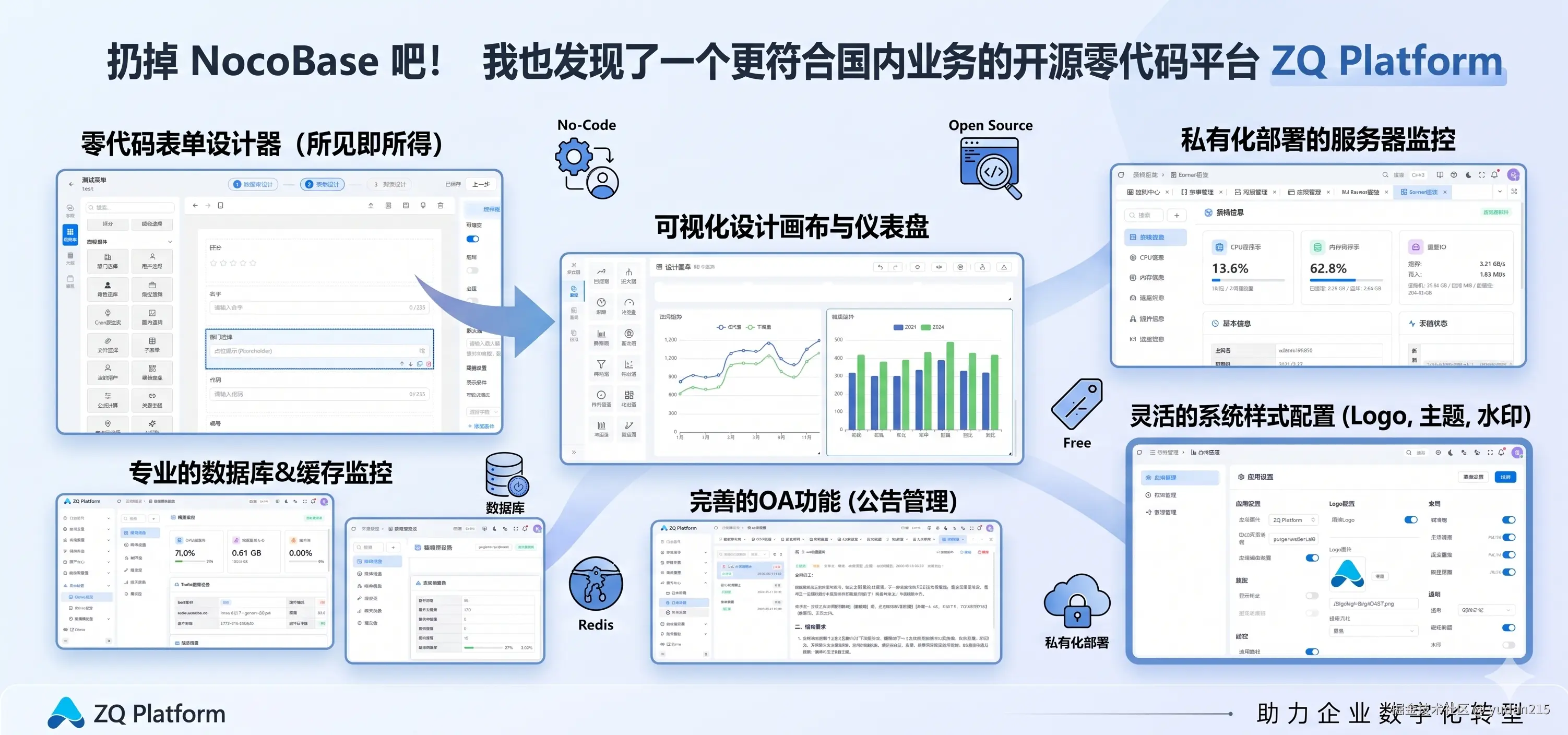 对比 NocoBase:更懂国内业务逻辑 NocoBase 是非常优秀的开源无代码平台,但有时候其交互逻辑和设计理念更偏向海外。ZQ Platform 从底层开始就深度贴合国内企业的使用习惯,无论从权限划分、系统监控还是UI审美,都更接地气。