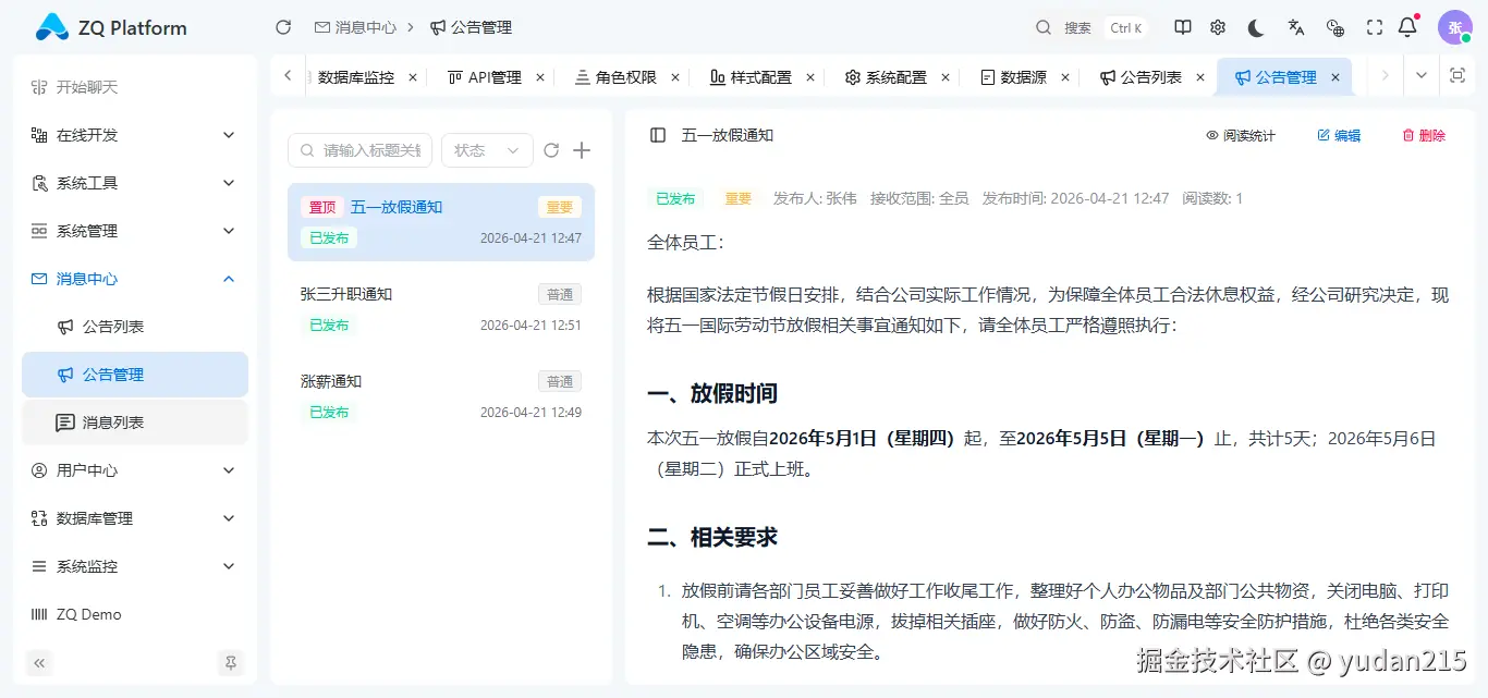对于企业而言,追求效率的提升与系统建设的“自主可控”始终是主旋律。ZQ Platform 以其高颜值、功能强大、完全开源免费的特性,为企业内部信息化建设提供了一个极佳的选项。