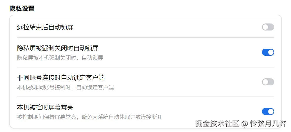 ToDesk 的隐私安全防护十分全面,除隐私屏外,还支持远控结束自动锁屏、隐私屏被强制关闭时自动锁屏、非同账号连接锁定客户端,同时可开启被控时屏幕常亮,兼顾隐私安全与连接稳定性。