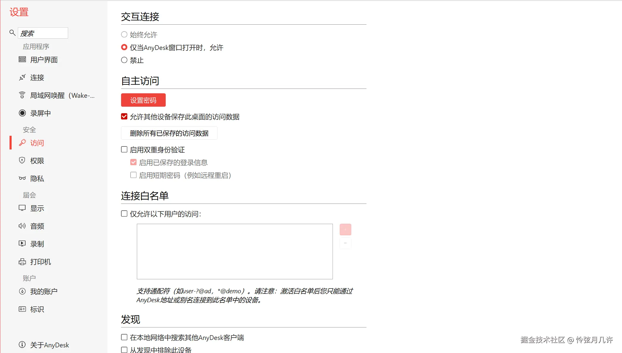 AnyDesk 的安全设置相对基础,仅提供了自主访问密码、双重身份验证、连接白名单等基础防护功能,整体安全机制设计较为简单,缺少 ToDesk 这类成熟的二次验证、设备绑定、隐私屏联动锁屏等进阶安全防护,对国内用户的隐私安全防护需求覆盖不够全面。