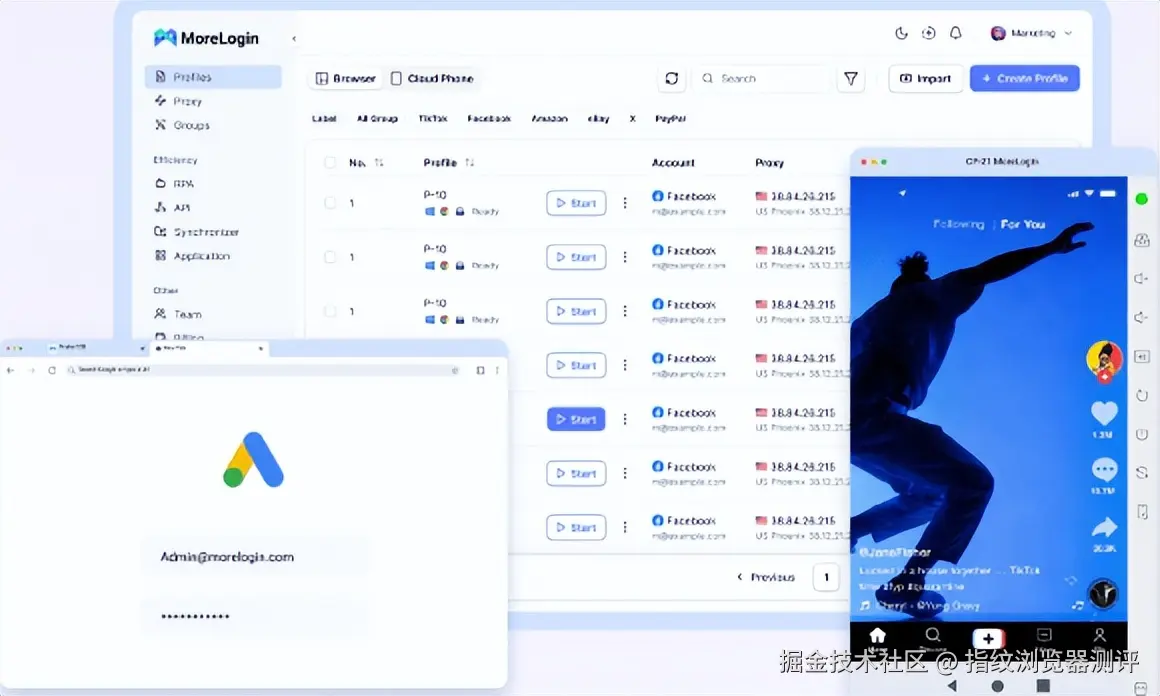 MoreLogin 的技术亮点在于其真实的 Canvas 指纹采集技术,并且支持 Selenium/Puppeteer 等自动化框架。Morelogin 区别于其他纯网页端浏览器的核心功能:MoreLogin 和比特浏览器同样是内置云手机功能的。如果你不仅需要做网页端的防关联,还需要在移动端跑 TikTok 或 Instagram 的 App 矩阵,它的云手机业务非常实用,且注册通常会附赠一定的云手机测试时长。