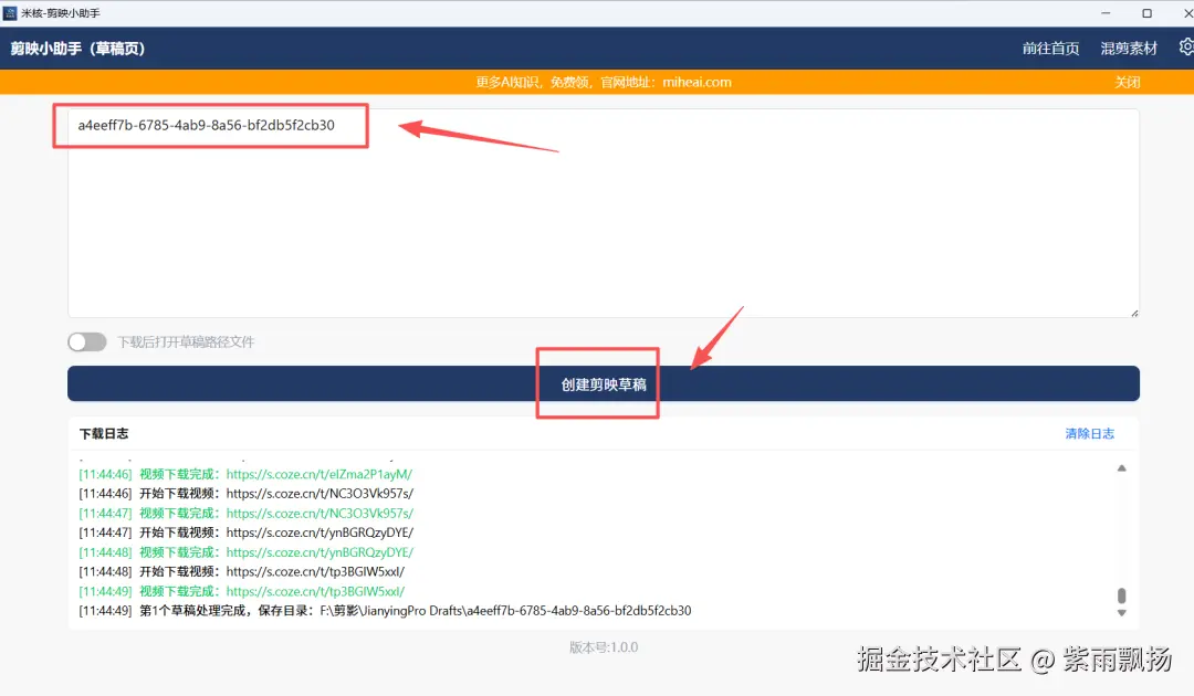 (2)将草稿ID输入到剪映小助手,点击创建剪映草稿;
