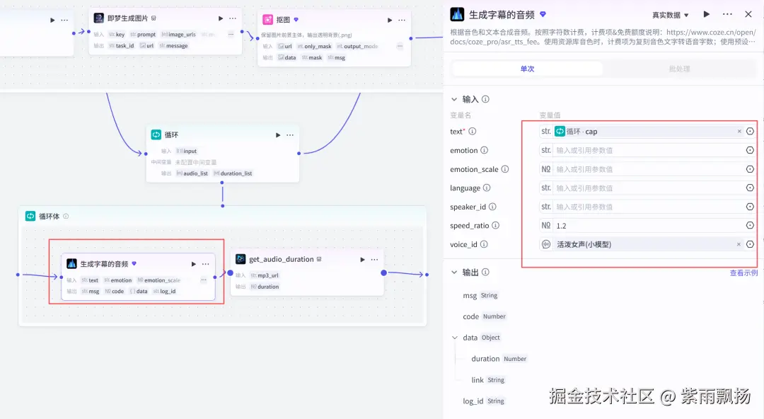 在循环体里的节点后面添加一个扣子官方的语音合成节点->设置参数;