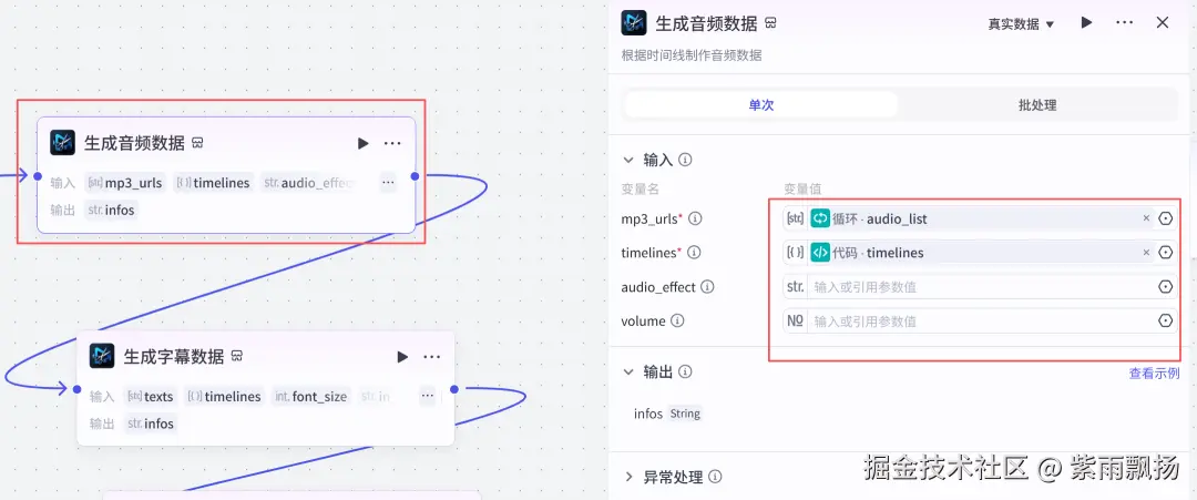在代码节点后面添加一个米核的【剪映小助手】的【audio_infos】节点->重命名为生成音频数据->设置参数;