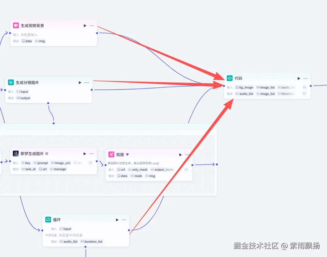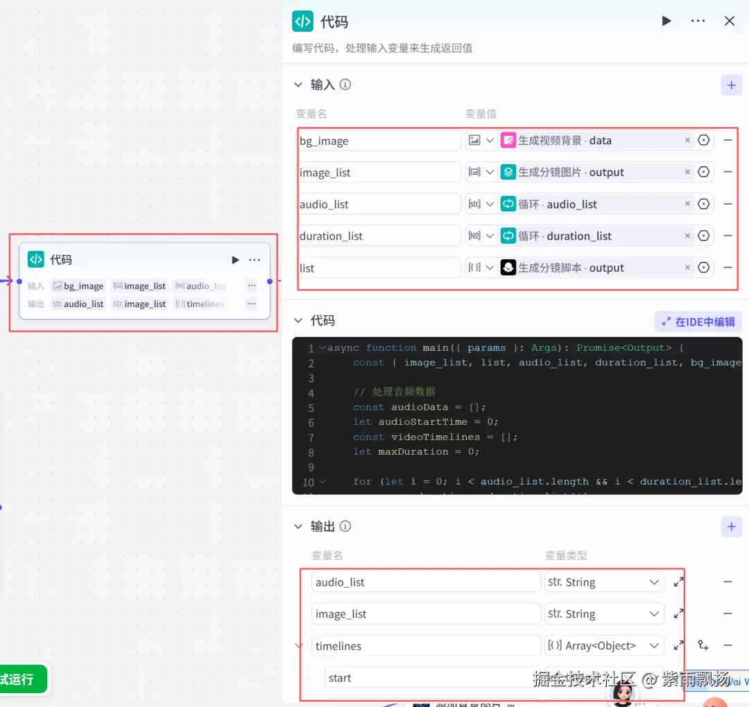 将生成视频背景和生成分镜图片以及循环三者的后面添加一个扣子官方代码的节点->设置参数;