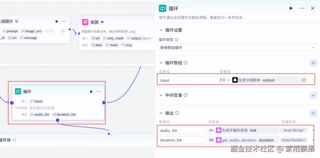在生成分镜脚本节点后面添加一个扣子官方的循环节点->设置参数;