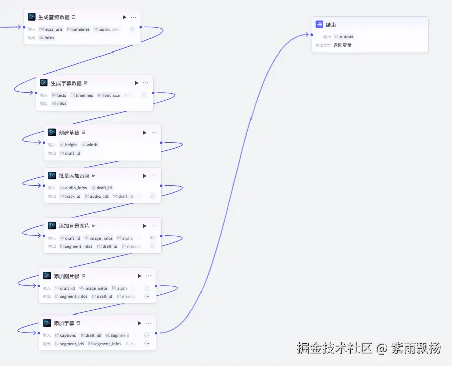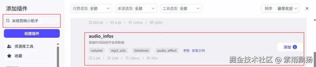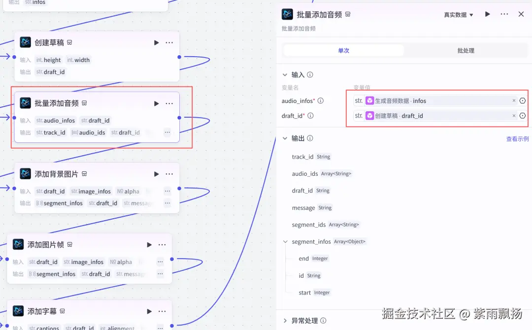 在创建草稿节点后面添加一个米核的【剪映小助手】的【add_audios】节点->重命名为添加音频->设置参数;