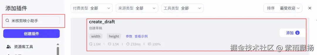 在生成字幕数据节点后面添加一个米核的【剪映小助手】的【create_draft】节点->重命名为创建草稿->设置参数;