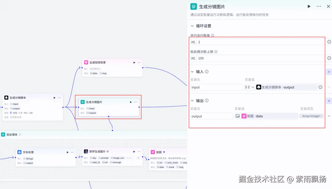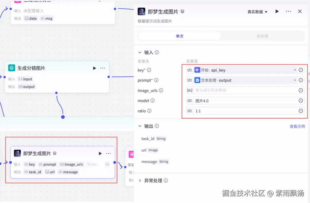 在批处理体的文本处理节点后面添加一个米核的 【即梦图片生成】 的【jimeng_generate_image】节点->设置参数;