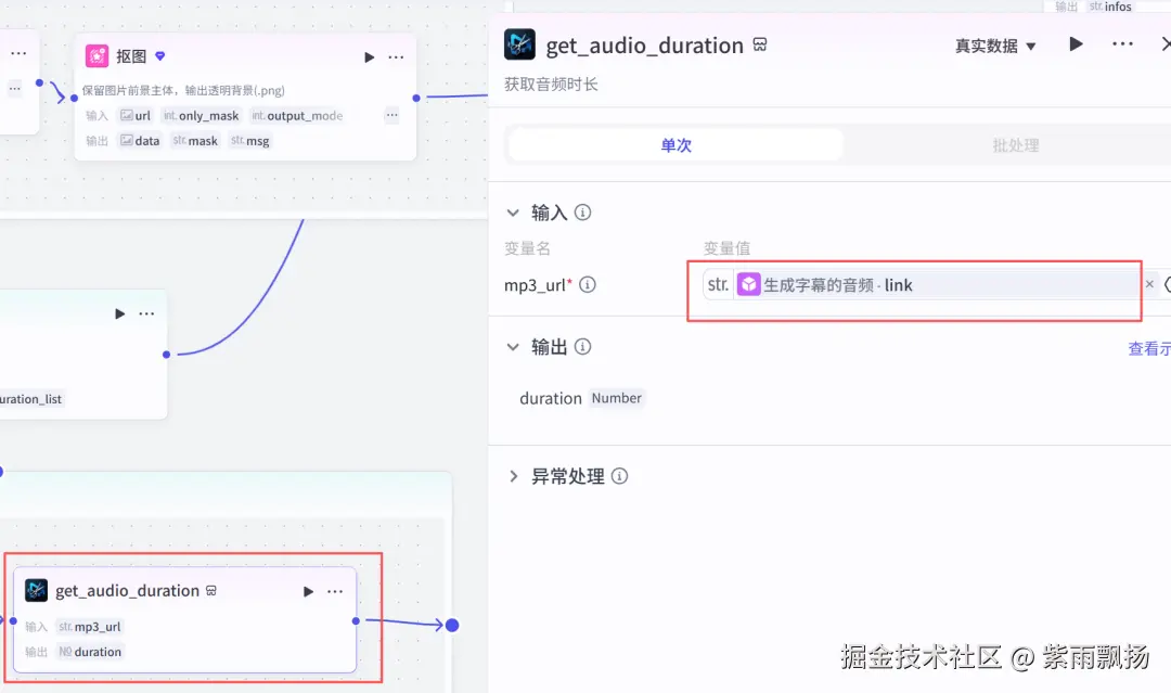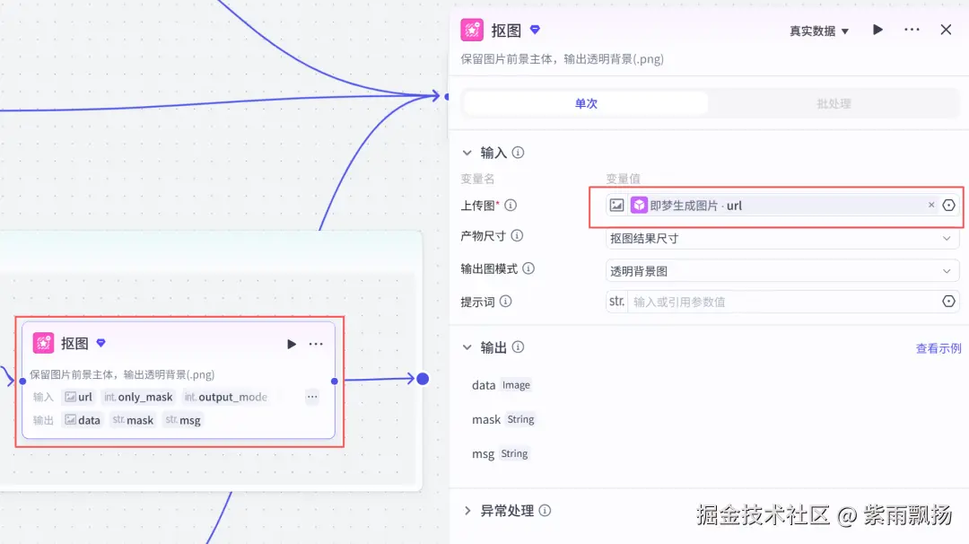 在批处理体的生图节点后面添加一个扣子官方的抠图插件节点->设置参数;
