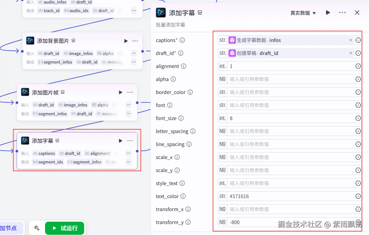 在生成音频节点后面添加一个米核的【剪映小助手】的【caption_infos】节点->重命名为生成字幕数据->设置参数;