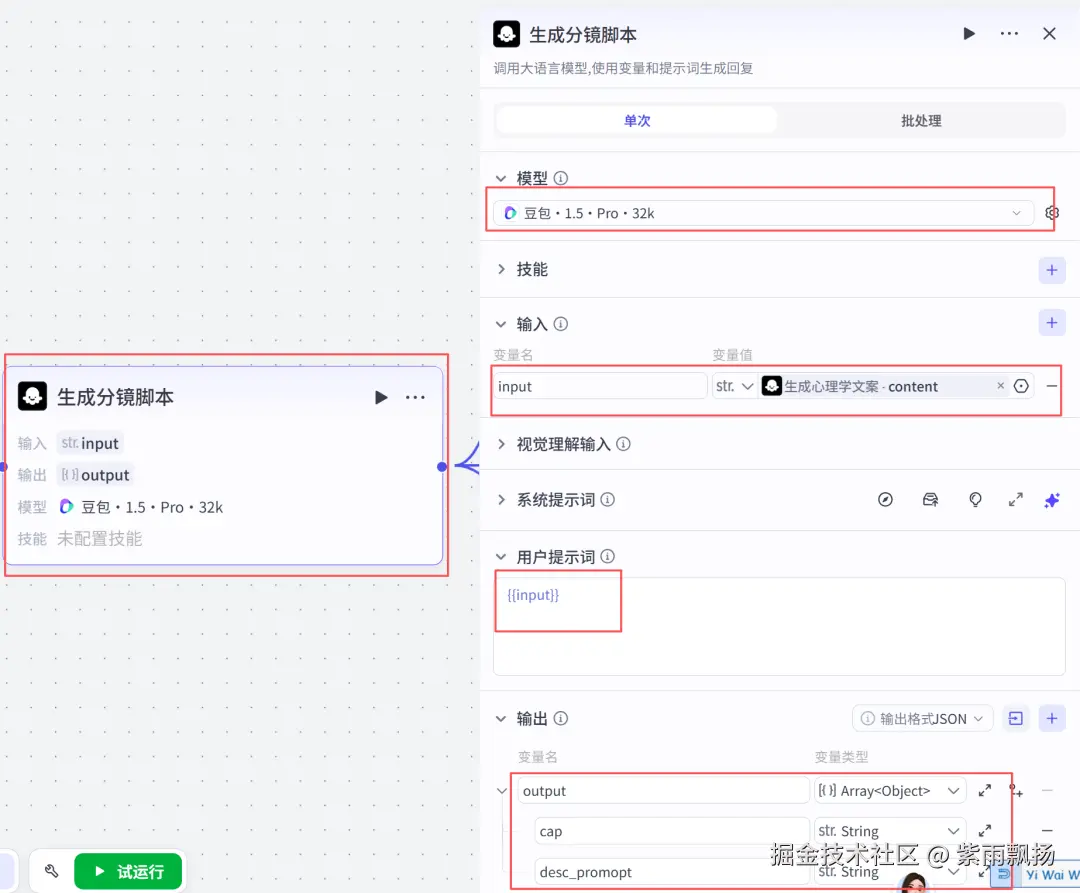 该节点的作用就是根据生成心理学文案来生成分镜脚本